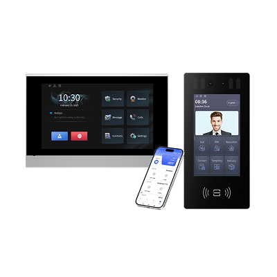 פנל מהודר עם מצלמות לזיהוי פנים, להקשה על / תחת הטיה. מסך מגע 7" לחיוג באמצע"קיט פנל 5.5" + מסך 7", זיהוי פנים מתקדם, קודן דיגיטלי כרטיס קרבה, התראות לנייד, למסך ולטלפון IP